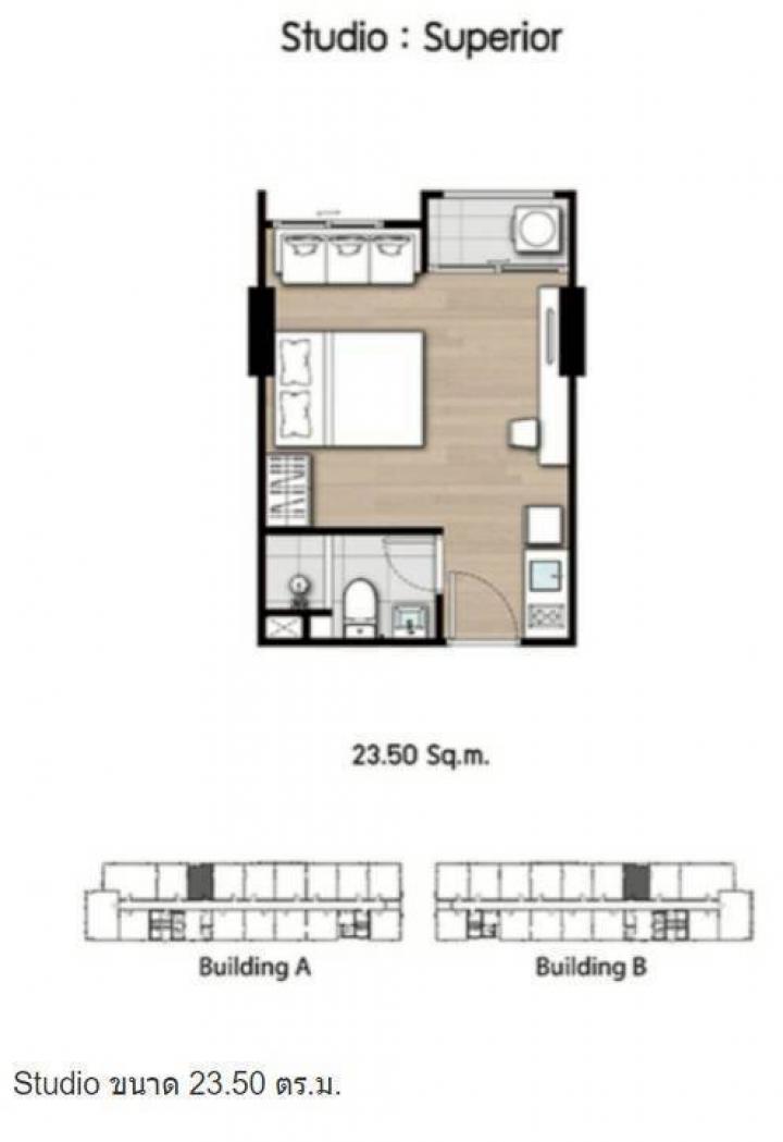 รายละเอียดเบื้องต้น : รายละเอียดห้อง - ขนาด 24 ตรม. - ชั้น 9 - รูปแบบห้อง Studio 1ห้องน้ำ